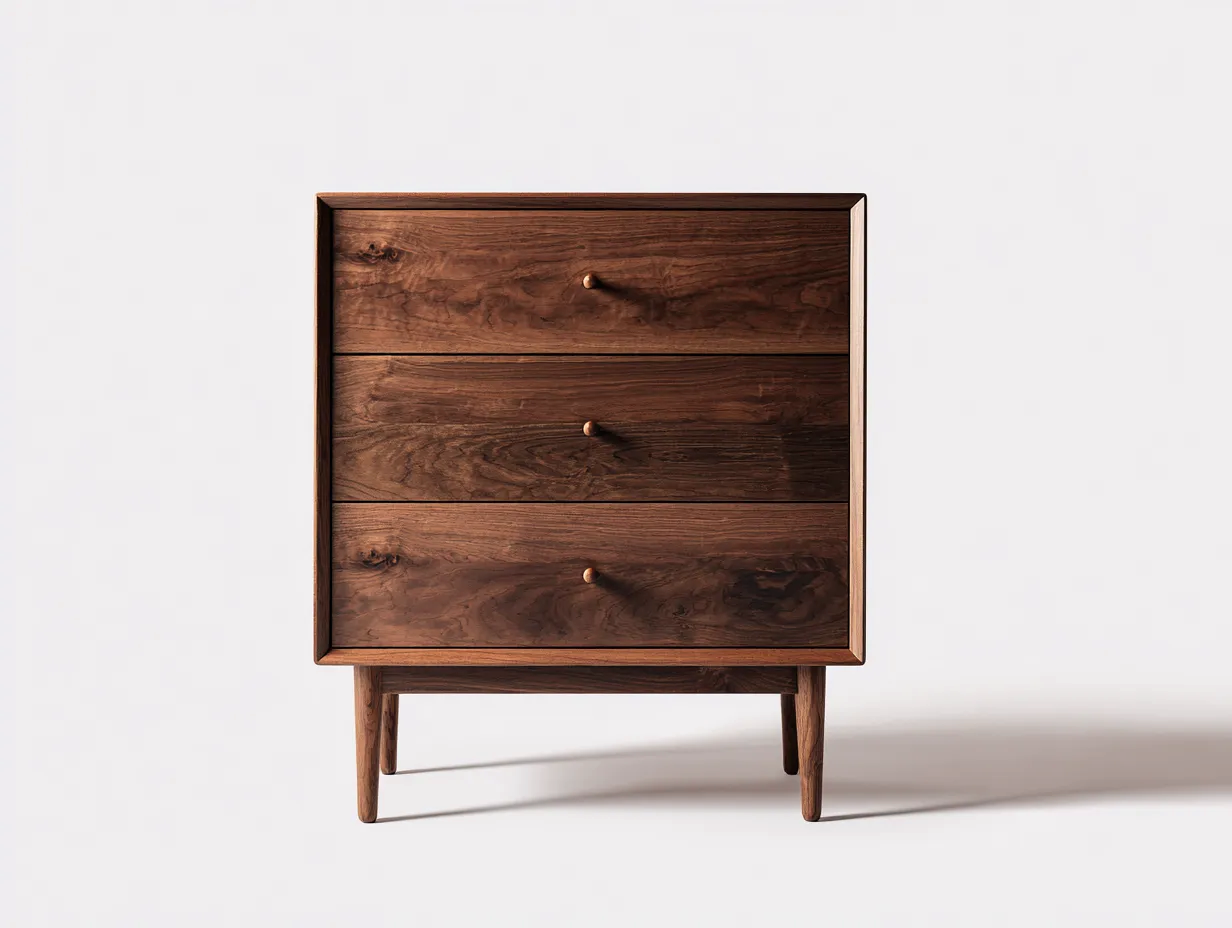 Dieser Nachttisch im Mid-Century Stil kombiniert natürliche Holzoptik mit einer klaren und zeitlosen Gestaltung. Die warme nussbraune Oberfläche und die ausgewogene Form bringen eine ruhige Atmosphäre in das Schlafzimmer. Das Möbelstück eignet sich ideal als praktische Ablage neben dem Bett und unterstützt eine ordentliche Organisation persönlicher Gegenstände.